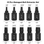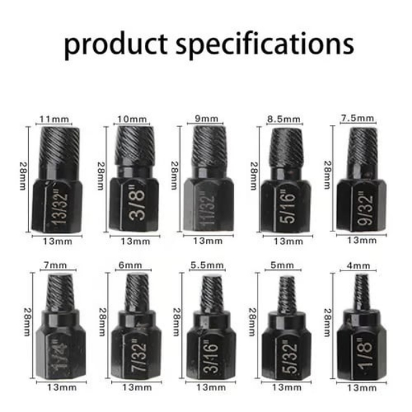 Įeina 10 varžtų ištraukiklių su plačiu dydžių pasirinkimu, kad visada būtumėte pasiruošę įvairioms ištraukimo užduotims.