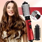 Šis karšto oro plaukų formavimo šepetys ir džiovintuvas turi du keičiamus besisukančius šepečius.