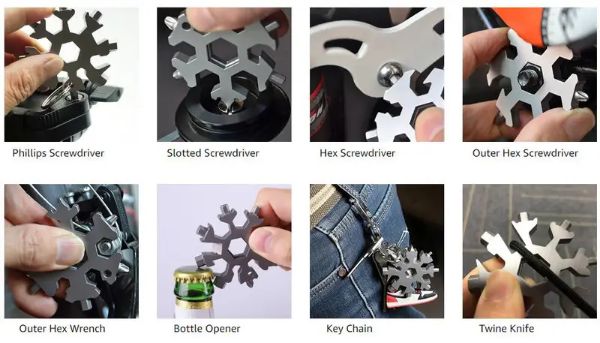 Daugiafunkcinis įrankis gali būti naudojamas alaus buteliui atidaryti, varžtui pasukti, snieglentei, dviračiui, žaislams ir kt.