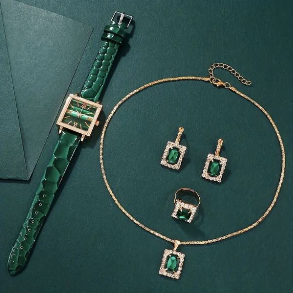 Šį elegantišką ansamblį sudaro retro stiliaus žalias laikrodis su kvadratiniu ciferblatu bei akinantis papuošalų su akmenimis rinkinys, leidžiantis ir patobulinti savo stilių, ir pasidalyti elegancija su artimaisiais. 🎁⌚💚