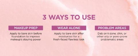 - MAKIAŽO PAGRINDAS VEIDUI IR PAAKIAMS: Tepkite ant švarios odos arba visiškai įsigėrus drėkikliui. Tepkite paakius, kad išlygintumėte smulkias raukšleles; nosį ir skruostus, kad užmaskuotumėte poras ir smulkius trūkumus; T zoną, siekdami išgauti matinį efektą.